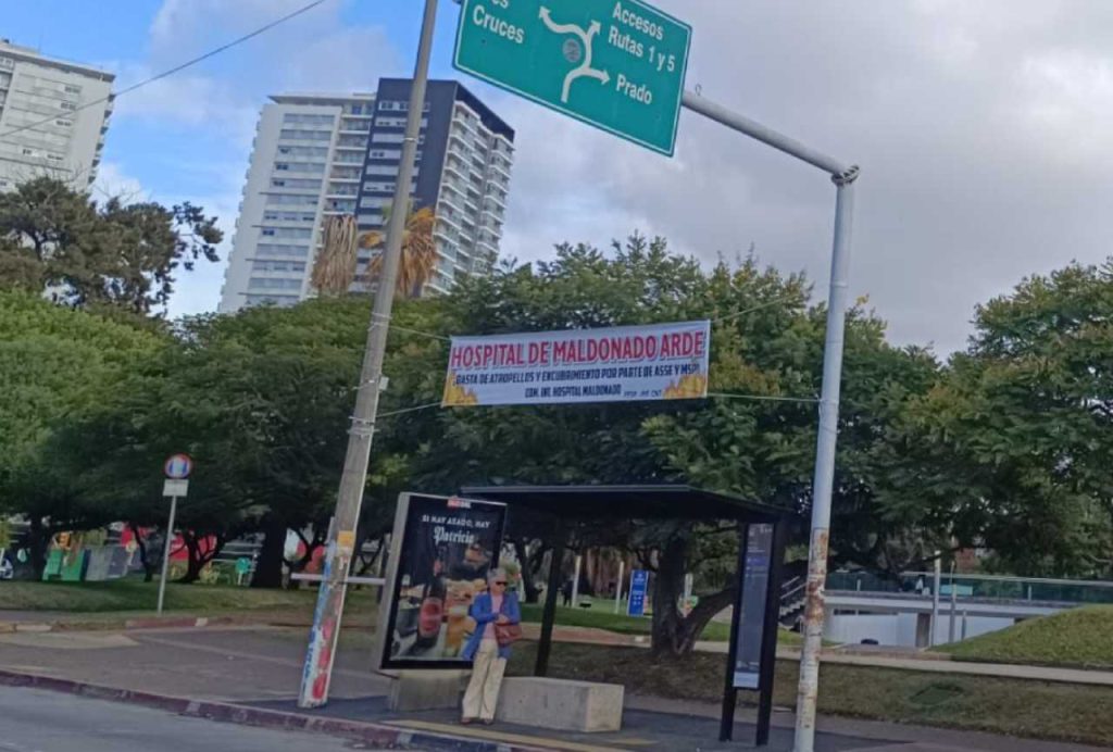 Un cartel de grandes dimensiones colocado en Montevideo frente a la sede de ASSE señala: “Hospital de Maldonado arde. Basta de atropellos y encubrimiento por parte de ASSE y del Ministerio de Salud Pública”, en referencia a un conflicto vinculado a denuncias contra un jefe de servicio del centro de salud.