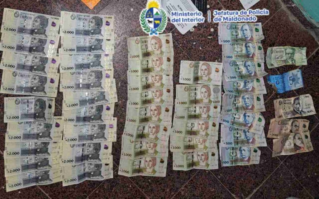 Durante el registro del masculino, se le incautó entre sus ropas la suma de 54.570 pesos uruguayos, así como comprobantes de transacciones con tarjetas correspondientes al comercio hurtado.