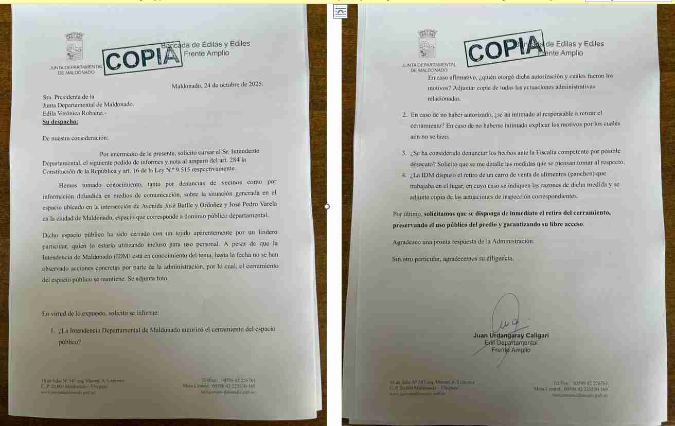 En el escrito presentado, Urdangaray señala que, a pesar de que la Intendencia está al tanto de la situación, hasta el momento no se han observado acciones concretas por parte de la administración, por lo que el cerramiento del espacio público continúa vigente.