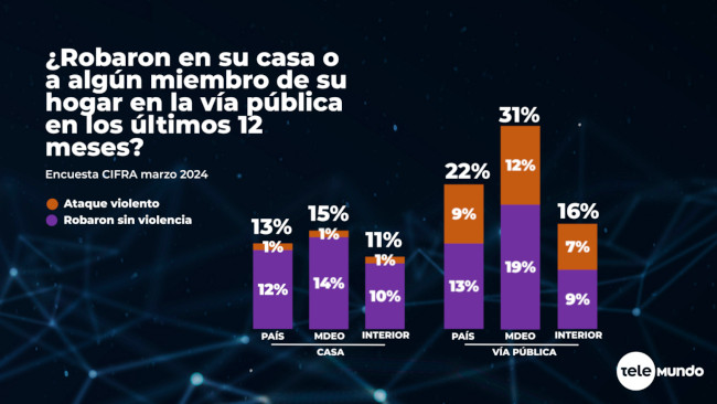 El 13% de los uruguayos fueron víctimas de robos en sus casas, mientras que el 22% lo fueron en la vía pública. Estos porcentajes sumados dan más de 29%, y esto se explica por las personas que fueron víctimas de ambos tipos de delitos.