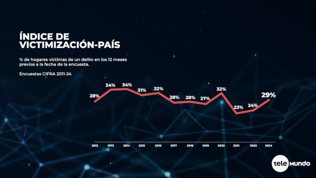De acuerdo a la última encuesta publicada por Cifra, en Telemundo (Canal 12) este martes 16 de abril, en los últimos 12 meses, el 29% de los hogares de todo el país vivieron algún robo o ataque violento: el índice de victimización de 2024 es dos puntos más alto que en 2019, mientras que es cinco puntos más bajo que hace una década.