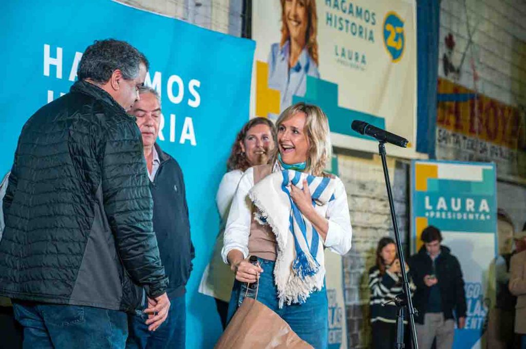 El pasado viernes 14 de junio, cuando comenzaba el acto de cierre de campaña de Laura Raffo en Maldonado, la precandidata fue sorprendida con un poncho que le obsequió Rodrigo Blás.