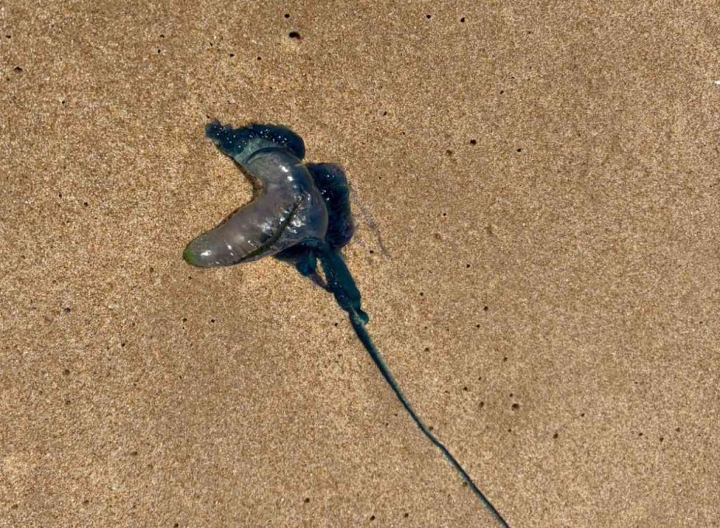 Failla detalló que, aunque visualmente parece un solo animal, en realidad se trata de una colonia compuesta por distintos individuos. Lo más visible es su flotador, similar a un globo inflado, que contiene gas y permanece en la superficie del mar. Debajo cuelgan, en forma vertical, los demás organismos, entre ellos los tentáculos, que pueden alcanzar varios metros de largo y poseen células urticantes con elevada toxicidad.