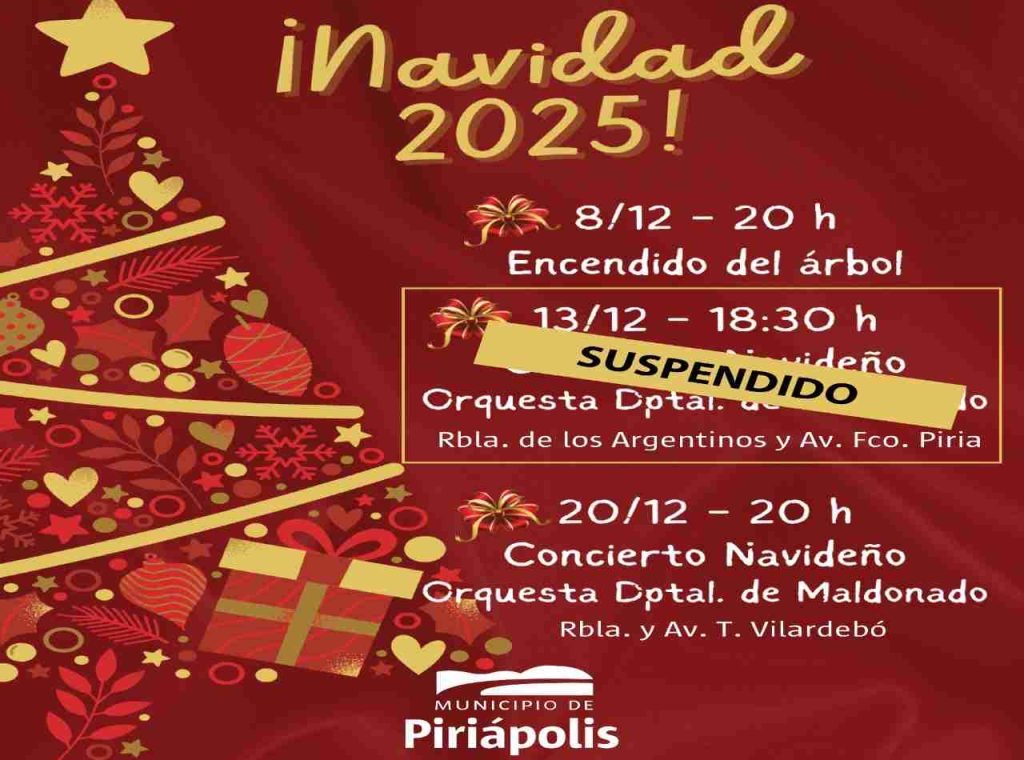 El Municipio de Piriápolis informó que, por razones ajenas a su organización, quedó suspendido el concierto navideño de la Orquesta Departamental de Maldonado, previsto para el sábado 13 de diciembre en la rotonda de la Rambla de los Argentinos y avenida Francisco Piria.