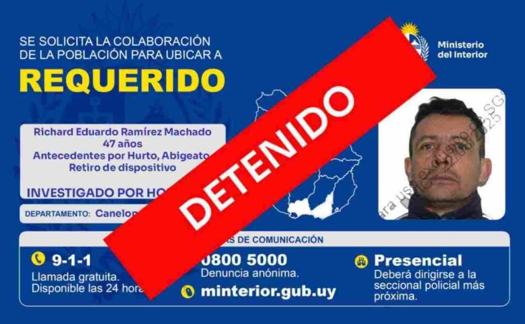 Personal de Homicidios del Departamento de Canelones realizó la detención de Richard Ramírez Machado durante la mañana de este lunes 15 de setiembre en Canelones, en el marco de un operativo policial.