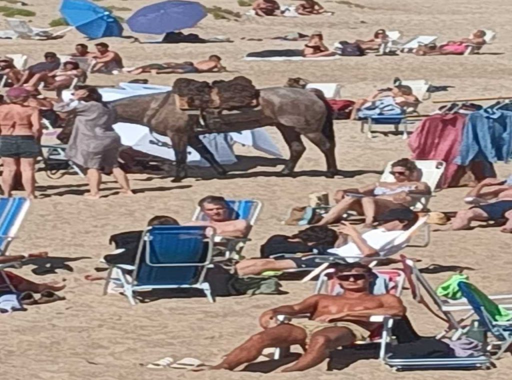 En ese lugar, una persona descendió a la playa montando un equino ensillado, desplazándose entre los bañistas.
