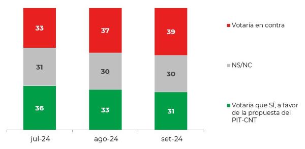 De acuerdo a la serie evolutiva de sondeos, en el último trimestre los juicios muestran un aumento de quienes están en contra de los promotores de la iniciativa (el apoyo cayó de 36% a 31% entre julio y setiembre). De cualquier forma, la persistencia de un alto nivel de indecisión (impulsado principalmente por la desinformación) mantiene incertidumbre sobre el desenlace final.