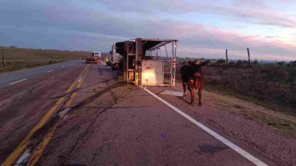 Por causas que se investigan, se produjo el vuelco de una zorra que transportaba ganado vacuno. El camión, que circulaba de norte a sur, volcó únicamente su acoplado (zorra), mientras la cabina no sufrió mayores consecuencias.